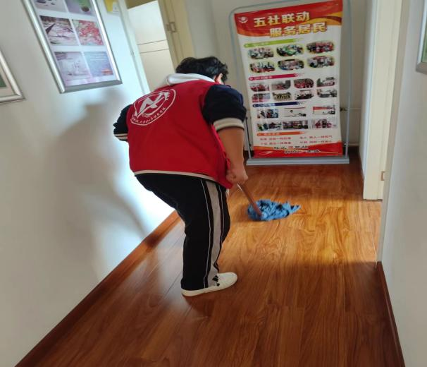 我院志愿者分组在社区居民活动室里进行清扫,大家热情高涨、干劲十足,拿着扫帚、抹布等工具,对棋牌室、舞蹈室、会议室、阳台等卫生死角进行全方位打扫。整个清扫过程细致、有序,不落下任何一个角落,不放过任何一片污渍。经过大家的清扫,社区居民活动室焕然一新,在场的每一位志愿者以自己的实际行动弘扬雷锋精神,感染着社区的每一位居民。