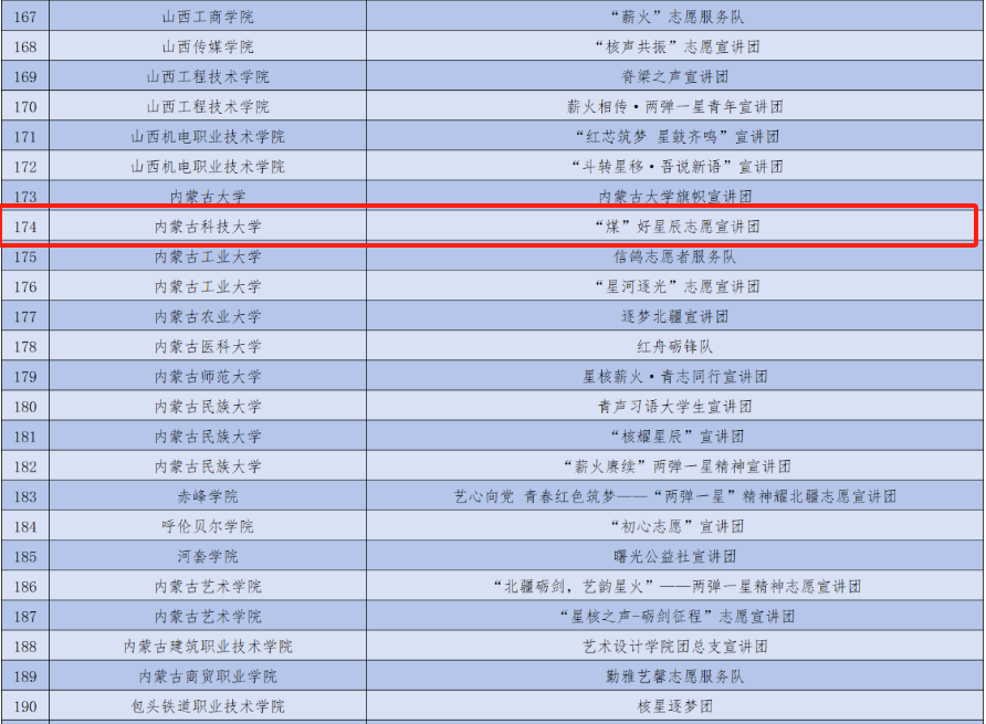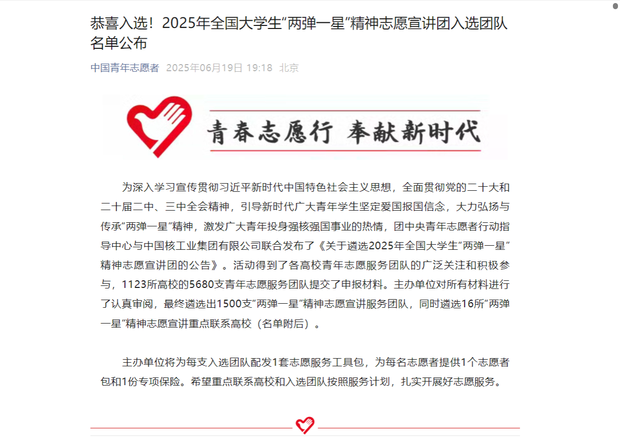为深入学习宣传贯彻习近平新时代中国特色社会主义思想,全面贯彻党的二十大和二十届二中、三中全会精神,引导新时代广大青年学生坚定爱国报国信念,大力弘扬与传承“两弹一星”精神,激发广大青年投身强核强国事业的热情,团中央青年志愿者行动指导中心与中国核工业集团有限公司联合发布了《关于遴选2025年全国大学生“两弹一星”精神志愿宣讲团的公告》。活动得到了各高校青年志愿服务团队的广泛关注和积极参与,1123所高校的5680支青年志愿服务团队提交了申报材料。主办单位对所有材料进行了认真审阅,最终遴选出1500支“两弹一星”精神志愿宣讲服务团队,同时遴选16所“两弹一星”精神志愿宣讲重点联系高校。我校best365手机版官方网站“煤”好星辰志愿宣讲团成功入选。