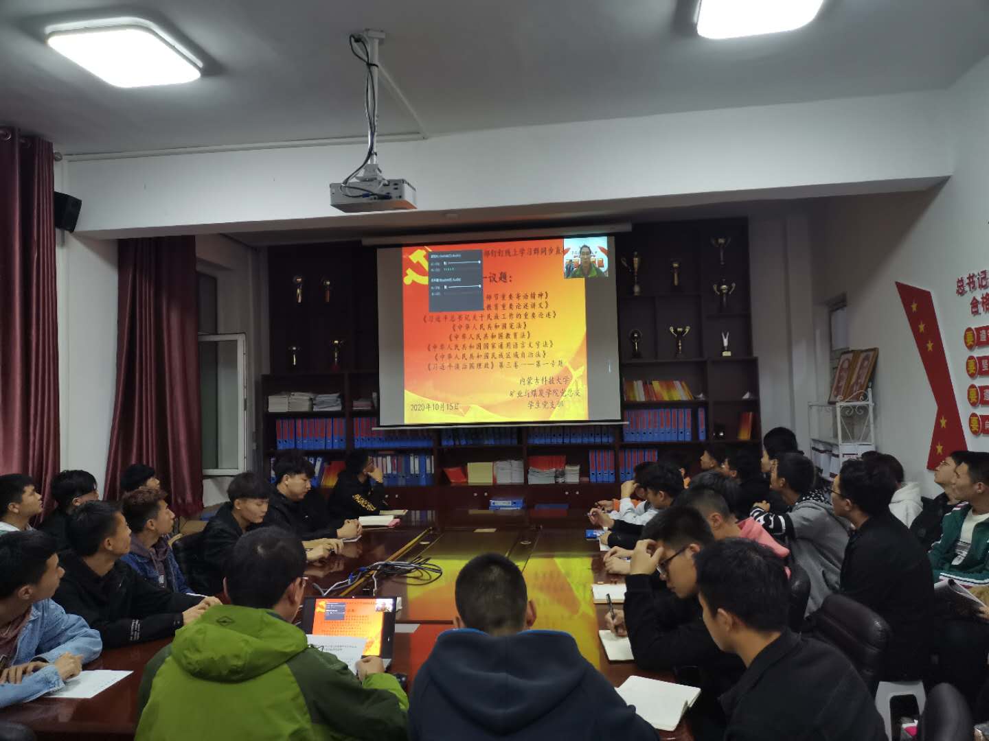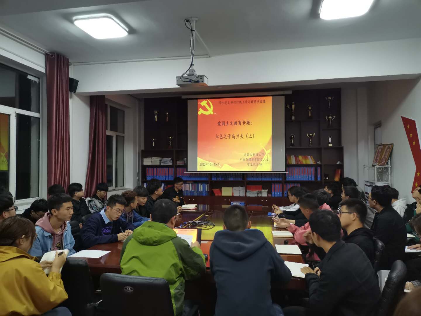 为进一步提高学生爱国主义观念和思想觉悟,矿业与煤炭学院党总支于2020年10月15日晚上19:30,在临曦楼二楼党员之家线上线下同步开展专题理论学习活动。本次学习内容是第一议题:《习近平总书记关于民族工作的重要论述》、《习近平谈治国理政》第三卷、《习近平总书记教师节重要寄语精神》、《习近平总书记教育重要论述讲义》;专题理论:《中华人民共和国宪法》、《中华人民共和国教育法》、《中华人民共和国国家通用语言文字法》、《中华人民共和国民族区域自治法》;爱国主义教育专题:观看《红色之子乌兰夫(上)》。