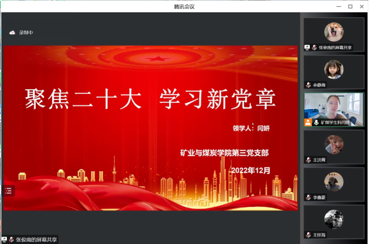 2022年12月13日下午16:30,best365手机版官方网站学生第三党支部利用腾讯会议平台开展党员党课学习,本次学习的主题是:聚焦二十大,学习新党章,领学人:闫妍同志。