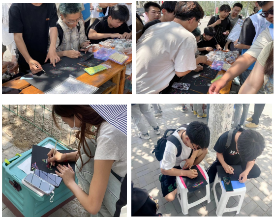 活动开始,工作人员把刮刮画所需画纸与竹签逐一分发给现场参与人员。同学们在拿到工具后,静静构思、仔细端详,在纸上比划着图形大小,利用手中竹签,细致勾勒线条,露出七彩底色。