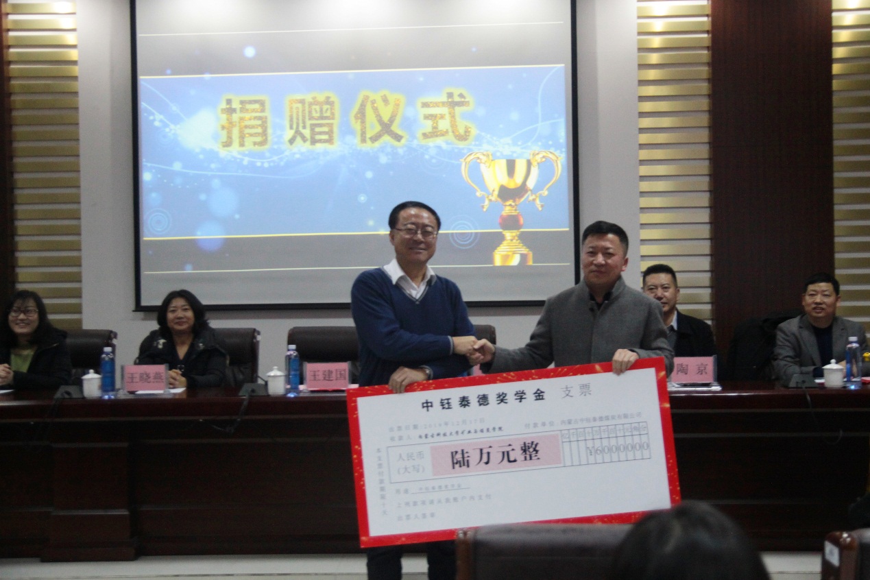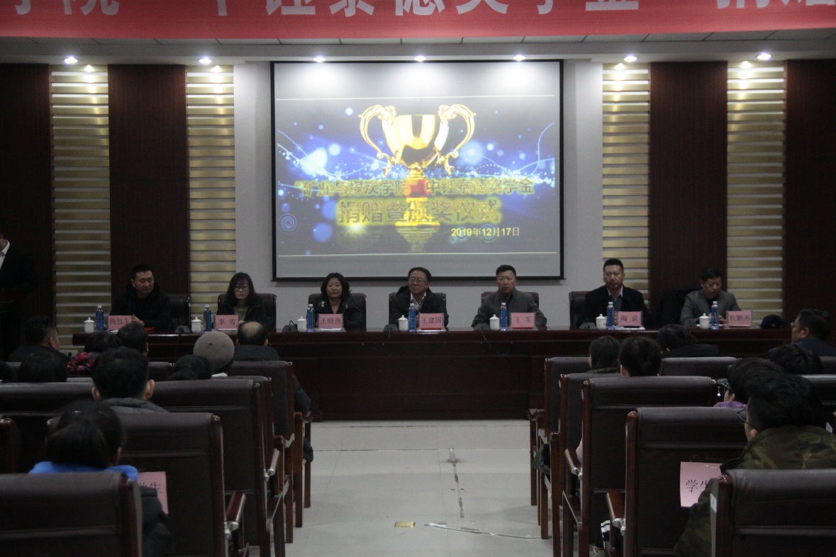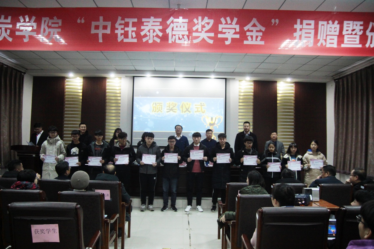 2019年12月17日下午16:30,best365手机版官方网站在实验实训楼会议室举行了“中钰泰德奖学金”捐赠暨颁奖仪式。出席本次会议的领导有:内蒙古中钰泰德煤炭有限公司董事长兼总经理王军、副总经济师王晓燕、人力资源部经理陶京、人力资源部社保主管李雪;best365手机版官方网站党总支书记王建国、副书记副院长杜鹏东、副院长杨包生、各系部主任,以及辅导员。