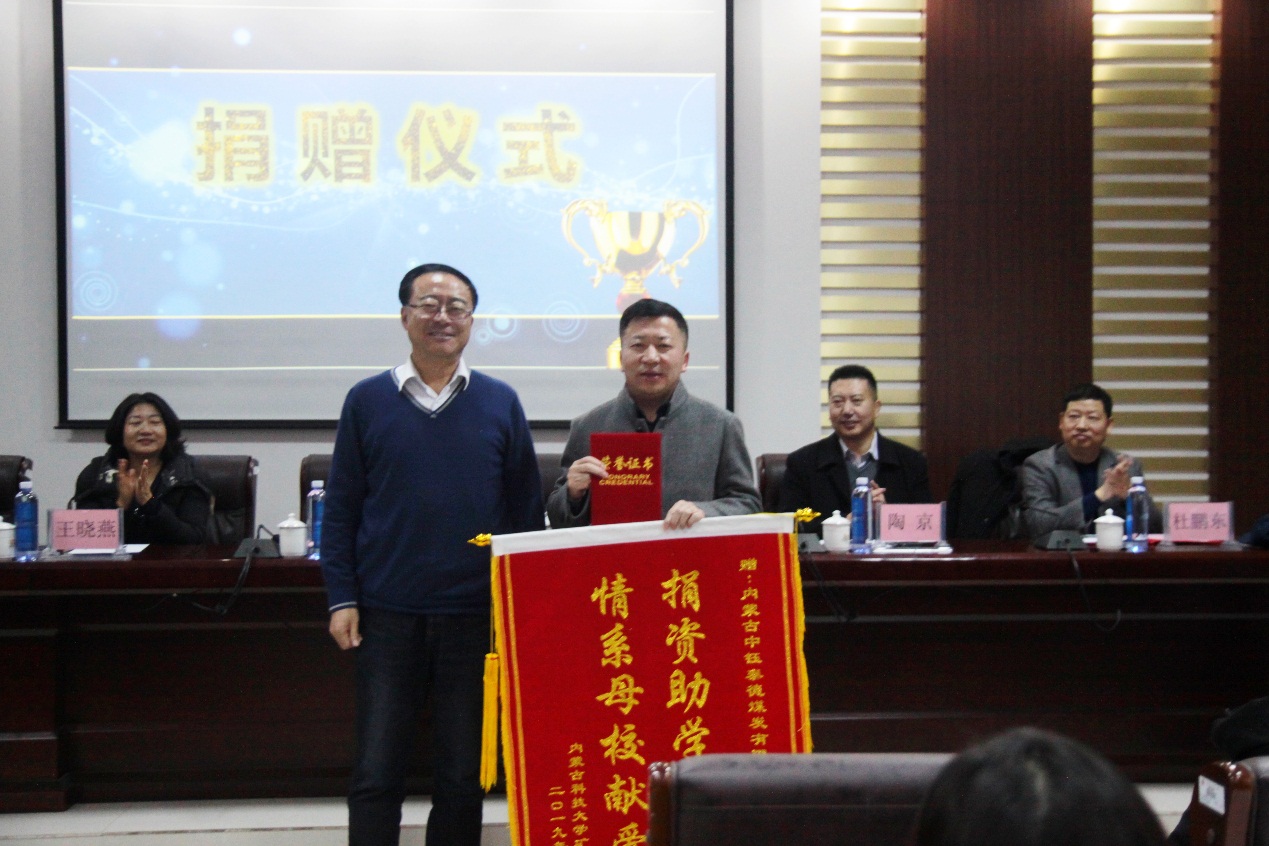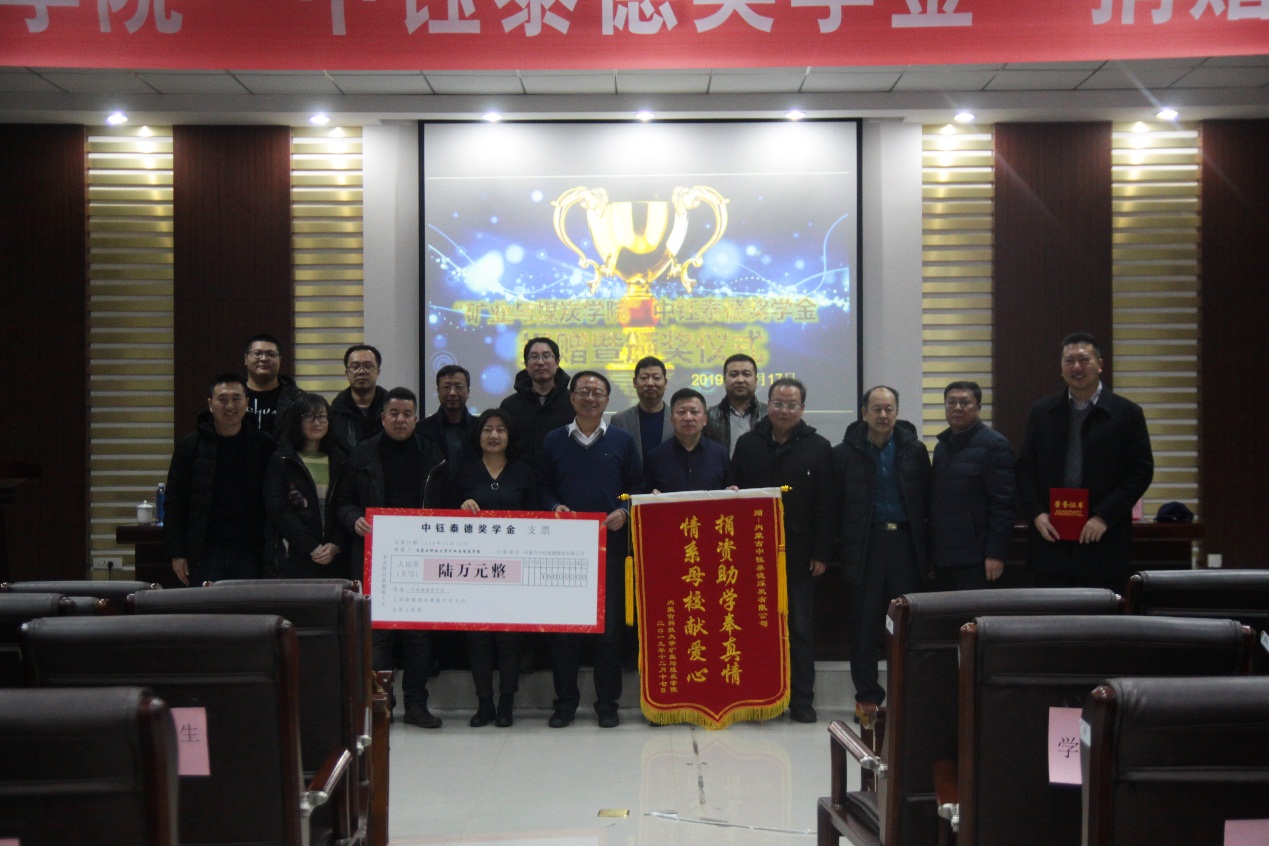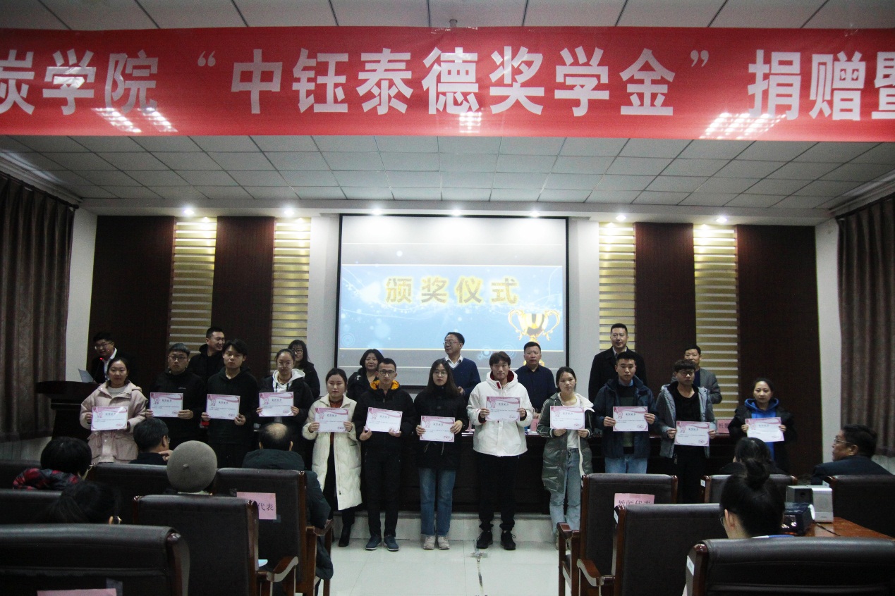 2019年12月17日下午16:30,best365手机版官方网站在实验实训楼会议室举行了“中钰泰德奖学金”捐赠暨颁奖仪式。出席本次会议的领导有:内蒙古中钰泰德煤炭有限公司董事长兼总经理王军、副总经济师王晓燕、人力资源部经理陶京、人力资源部社保主管李雪;best365手机版官方网站党总支书记王建国、副书记副院长杜鹏东、副院长杨包生、各系部主任,以及辅导员。