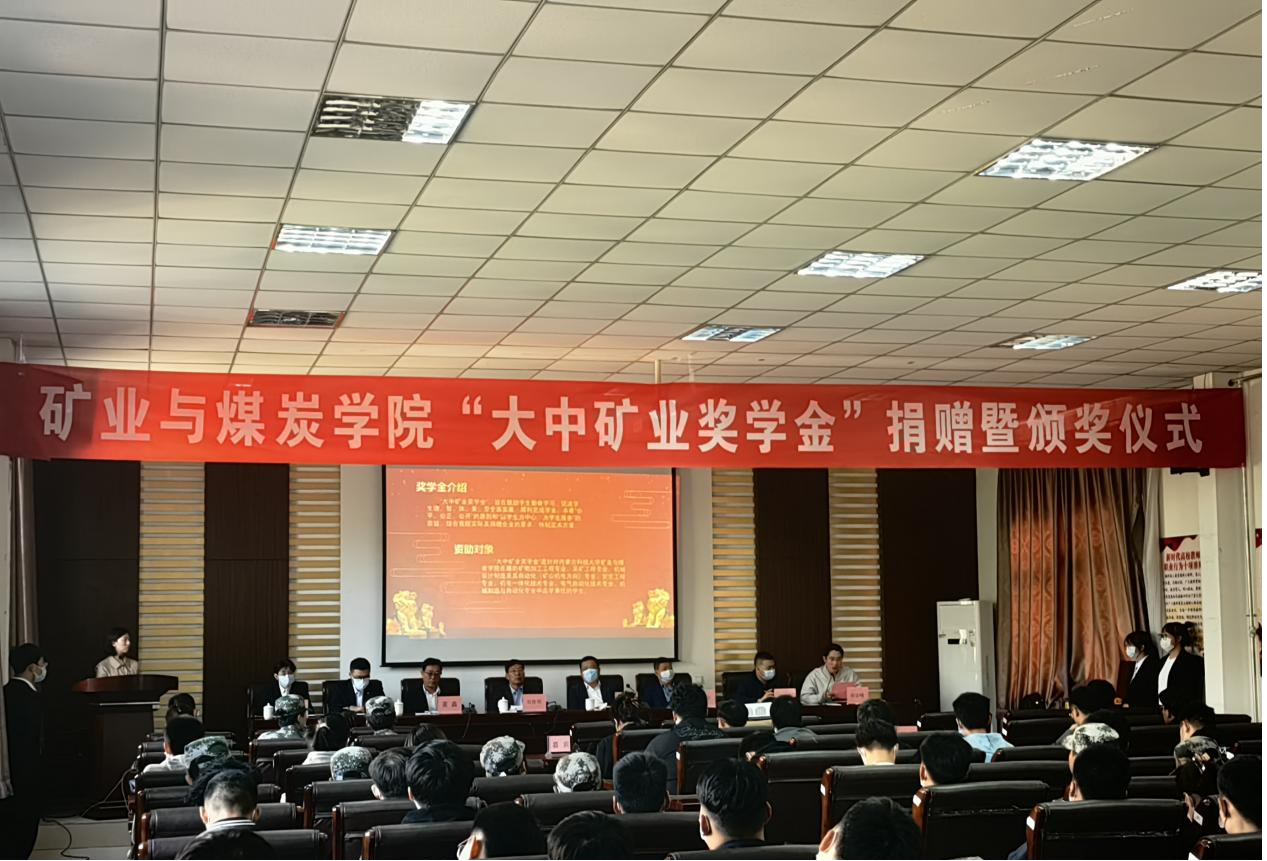 2022年9月23日下午15:00,best365手机版官方网站在实验实训楼会议室举行了“大中矿业奖学金”捐赠暨颁奖仪式。best365手机版官方网站党委副书记、校长任慧平;内蒙古大中矿业股份有限公司党委书记刘鲁明、总经理董鑫、人资培训中心总监王如海、副总监梁艳;best365手机版官方网站党委书记杜鹏东,副书记、副院长孙建平,学生工作办公室主任胡显峰、辅导员以及学生代表参加仪式。仪式由学生工作办公室副主任吴艳丽主持。