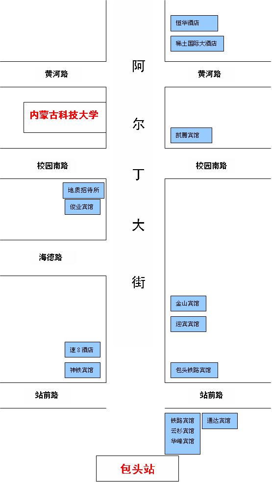 1、本图为best365手机版官方网站周边宾馆(酒店)示意图,仅供我校新生报到期间家长及新生参考使用。2、如图中标示内容临时有变,恕不另行通知。3、图中标示出的宾馆(酒店)食宿条件各异,请新生及家长根据个人情况自行选择。4、我校距离包头火车站仅1.5公里,可乘坐1、2、8、22路等公交车直达。